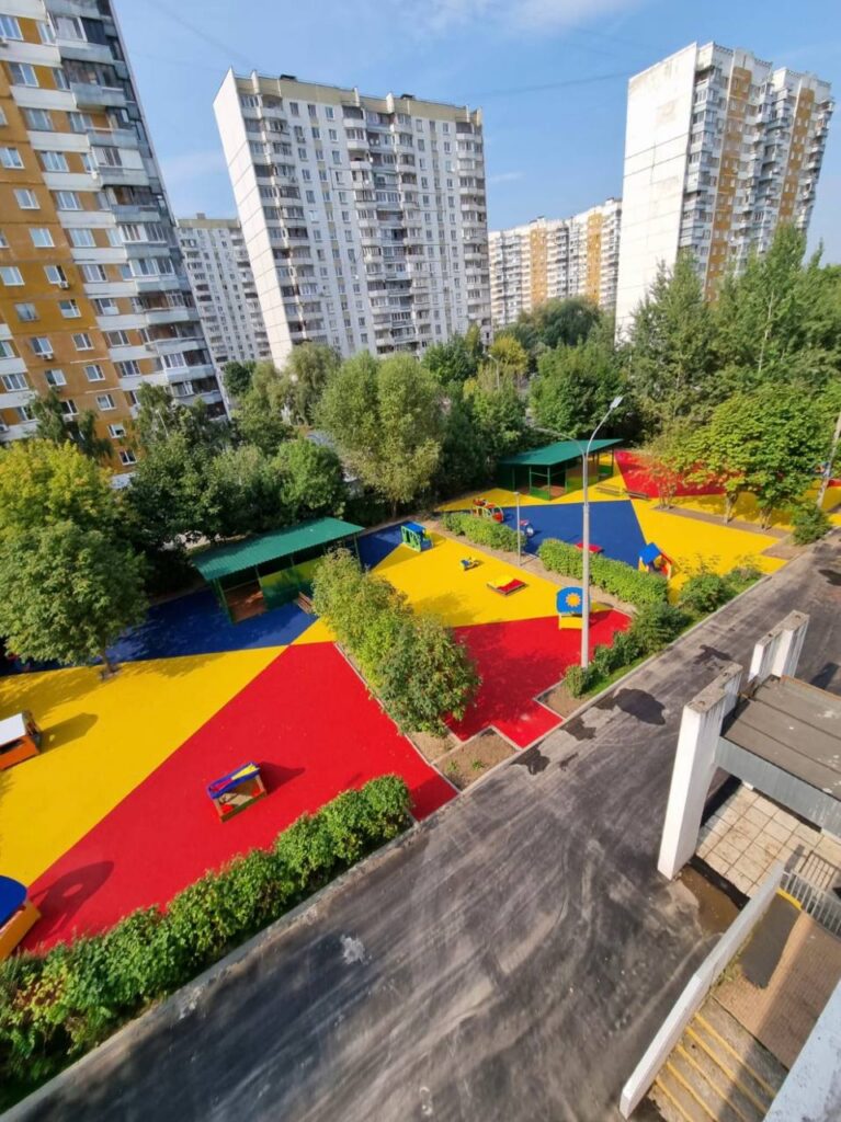 Яркие и стабильные цвета, делают ее незаменимой для финишного слоя травмобезопасных покрытий.